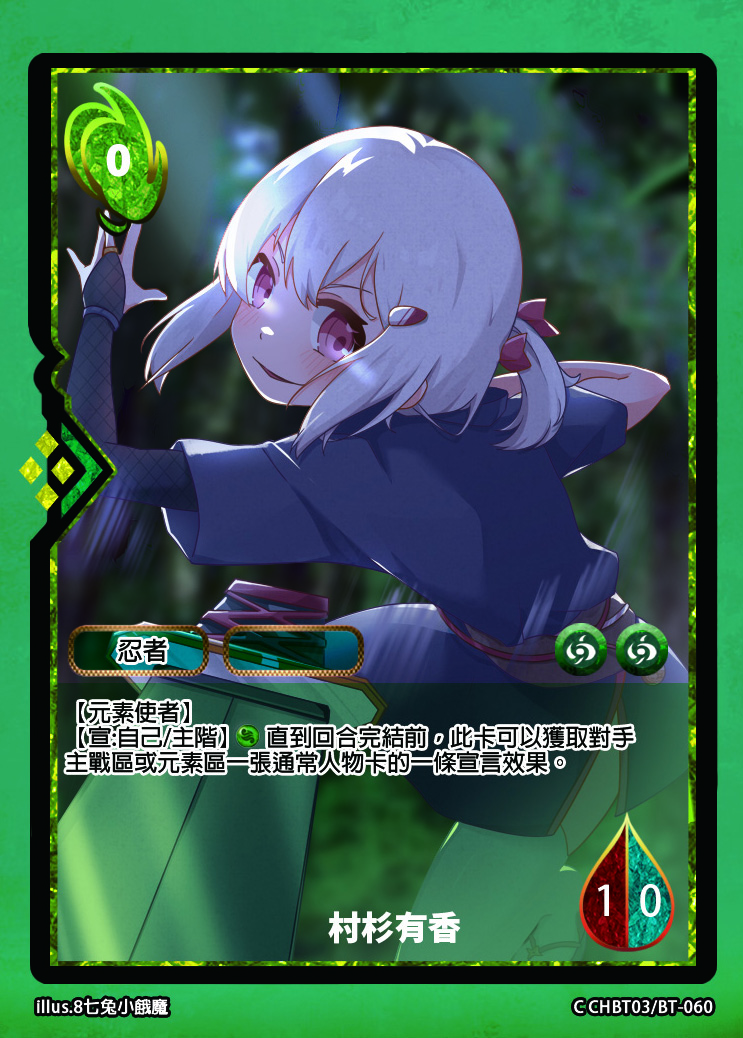 【宣:自己/戰階】(移除對手最多三個元素)自己元素區一張人物卡生成X個元素,X為本次宣言所移除對手元素的數量。