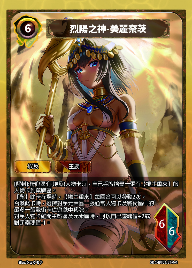 [解封]:核心區有{埃及}人物卡時,自己手牌捨棄一張有【捲土重來】的人物卡到棄牌區。