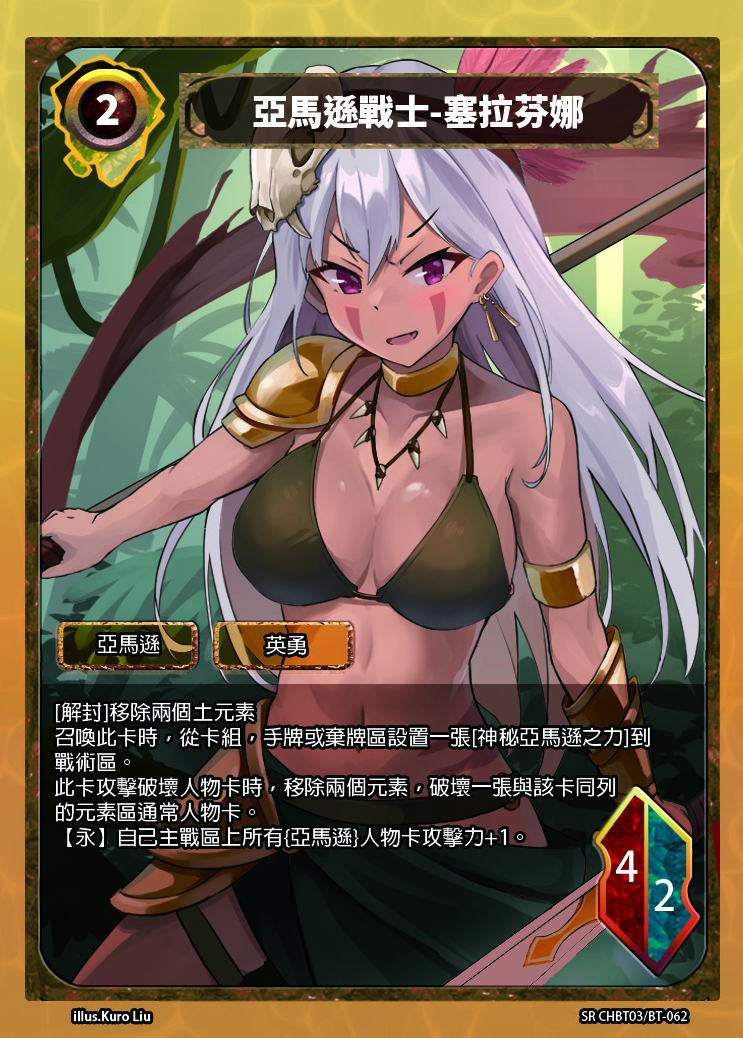 此卡攻擊破壞人物卡時,移除兩個元素,破壞一張與該卡同列的元素區通常人物卡。