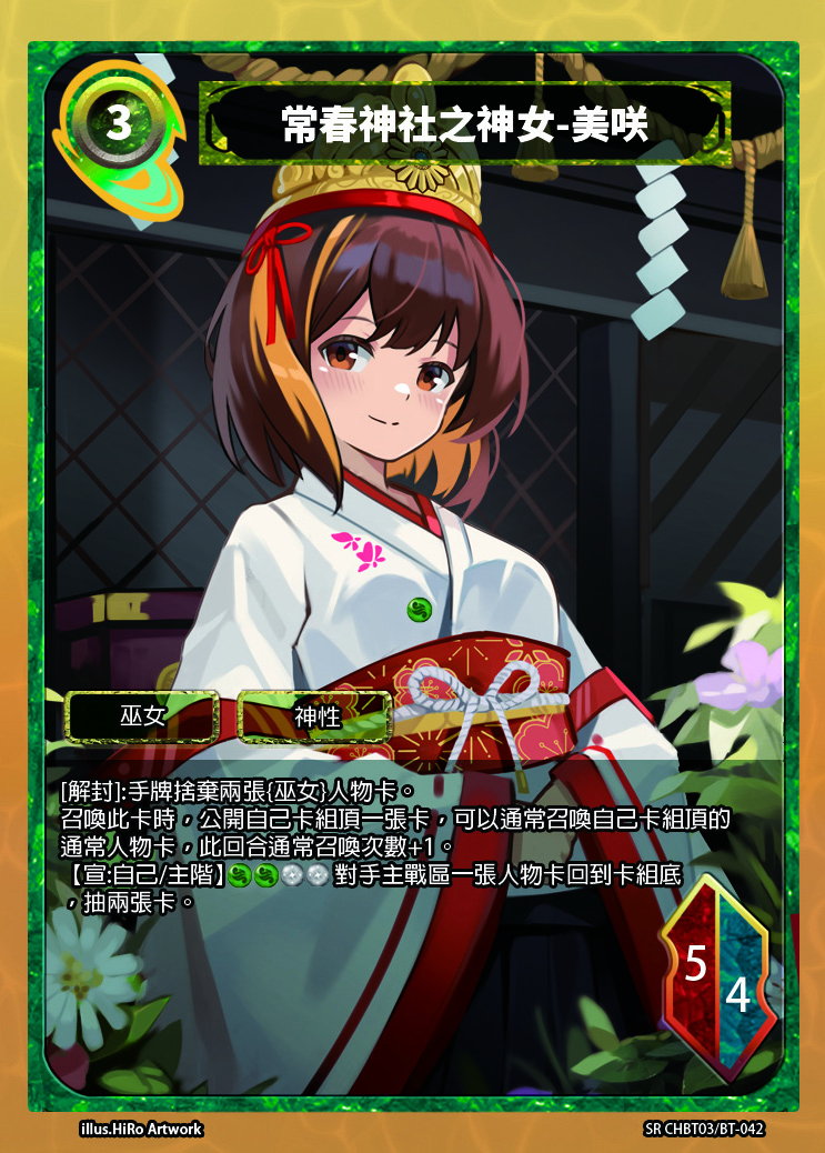 此卡攻擊時,自己可以將主戰區一張{巫女}人物卡回到手牌,對手主戰區一張通常人物卡回到卡組底。