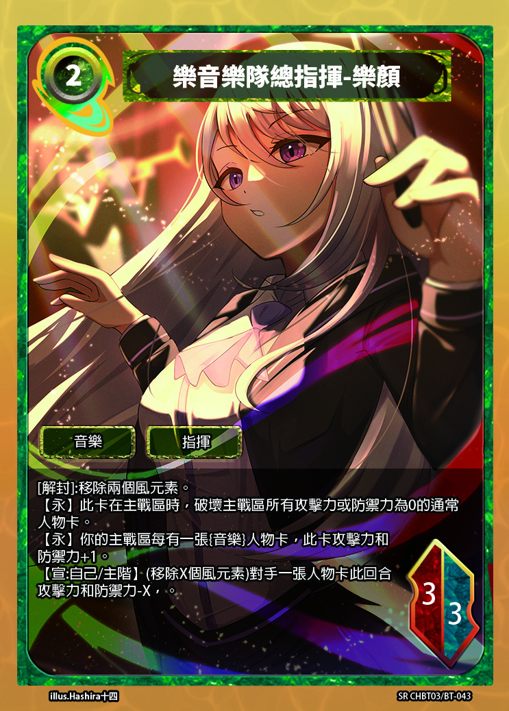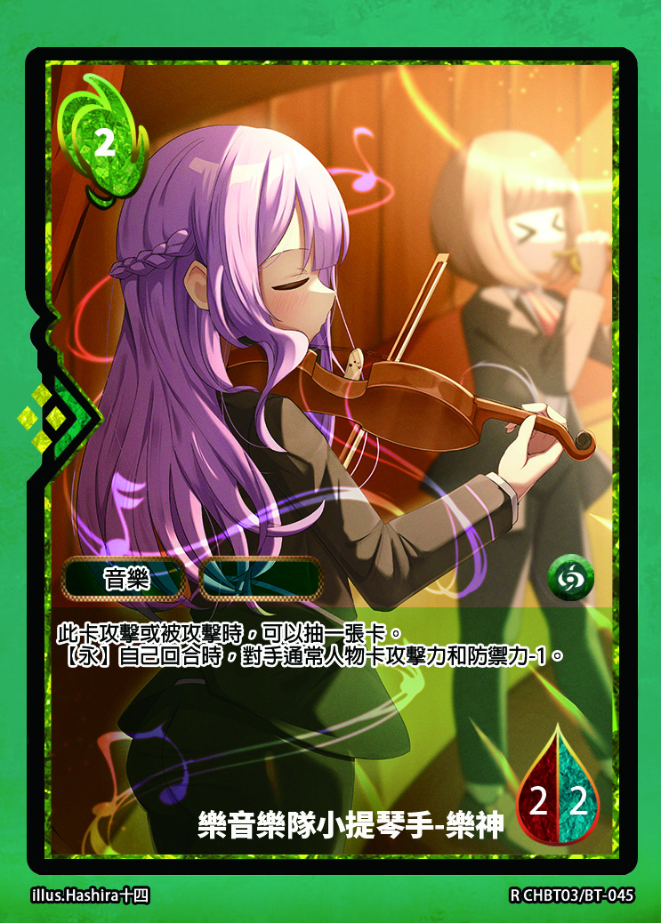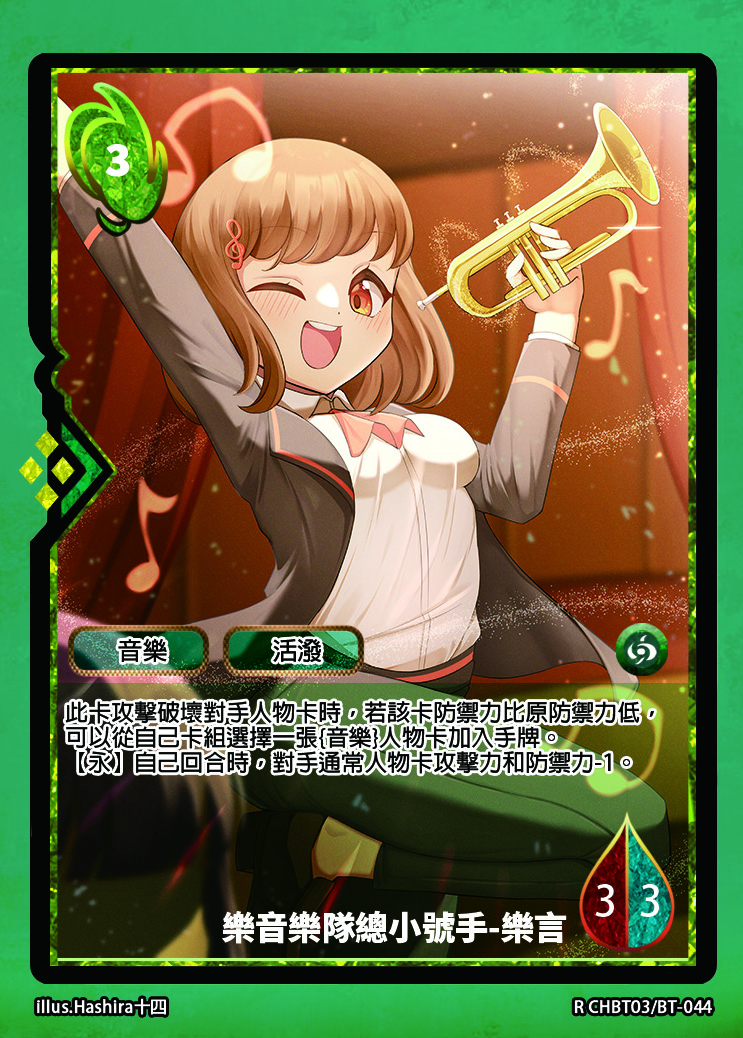 此卡攻擊破壞對手人物卡時,若該卡防禦力比原防禦力低,可以從自己卡組選擇一張{音樂}人物卡加入手牌。