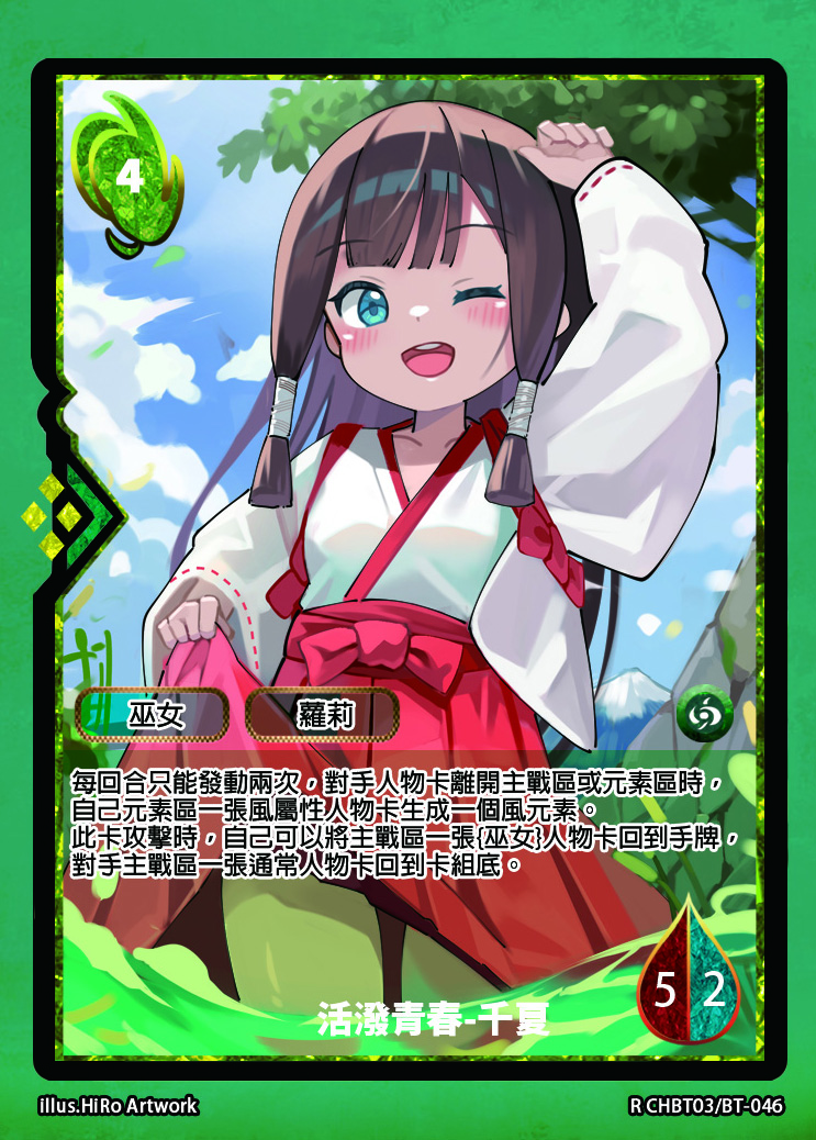 每回合只能發動兩次,對手人物卡離開主戰區或元素區時,自己元素區一張風屬性人物卡生成一個風元素。