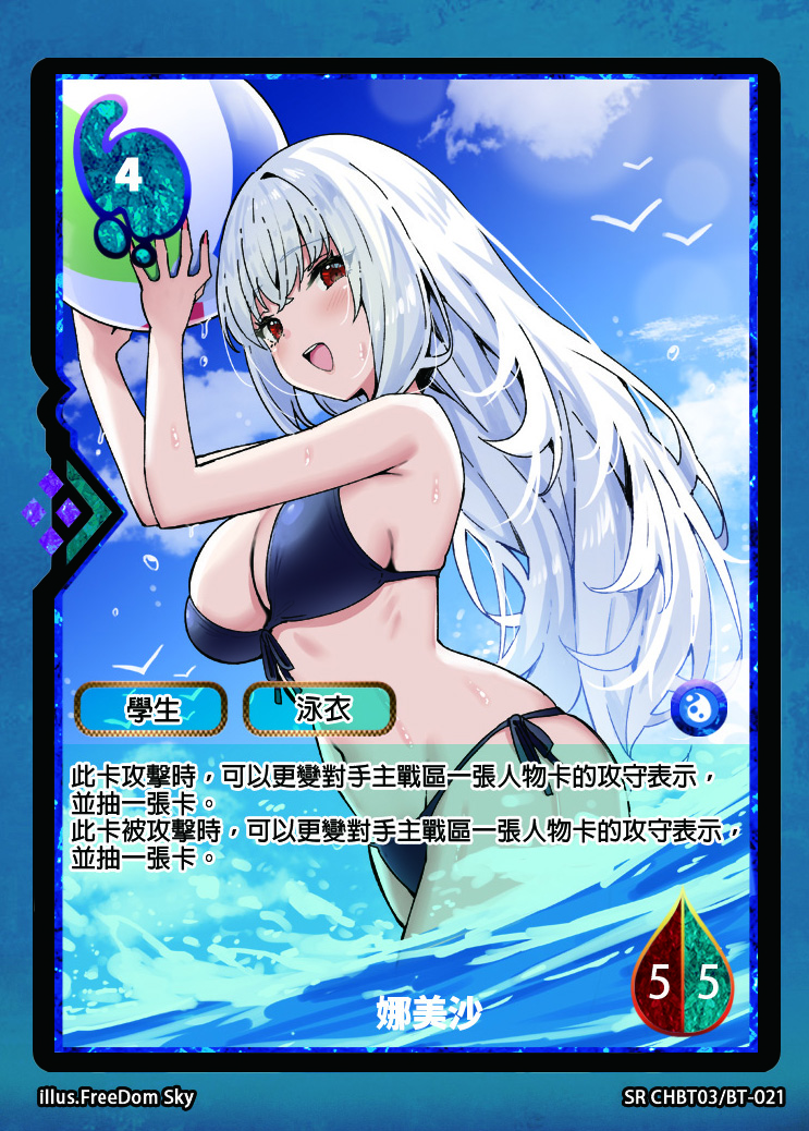 此卡戰鬥完結時,可以移除兩個元素。移除的話,破壞對手主戰區一張通常人物卡,並且對手靈魂值-2。