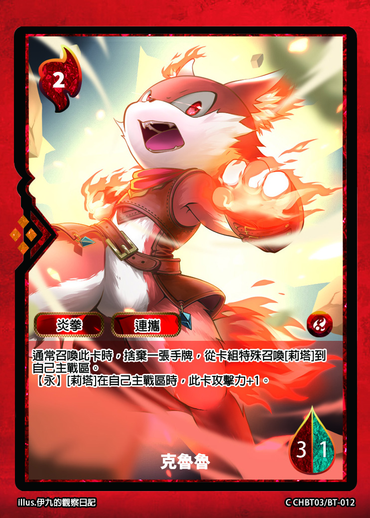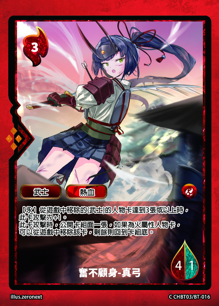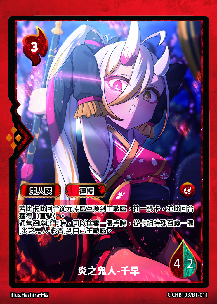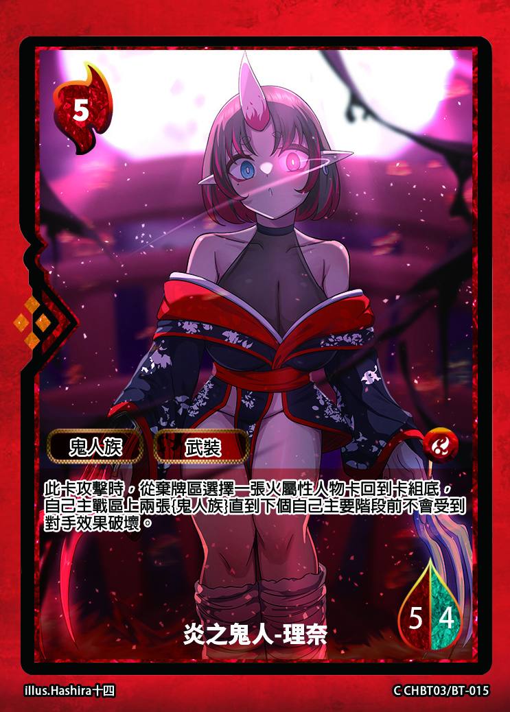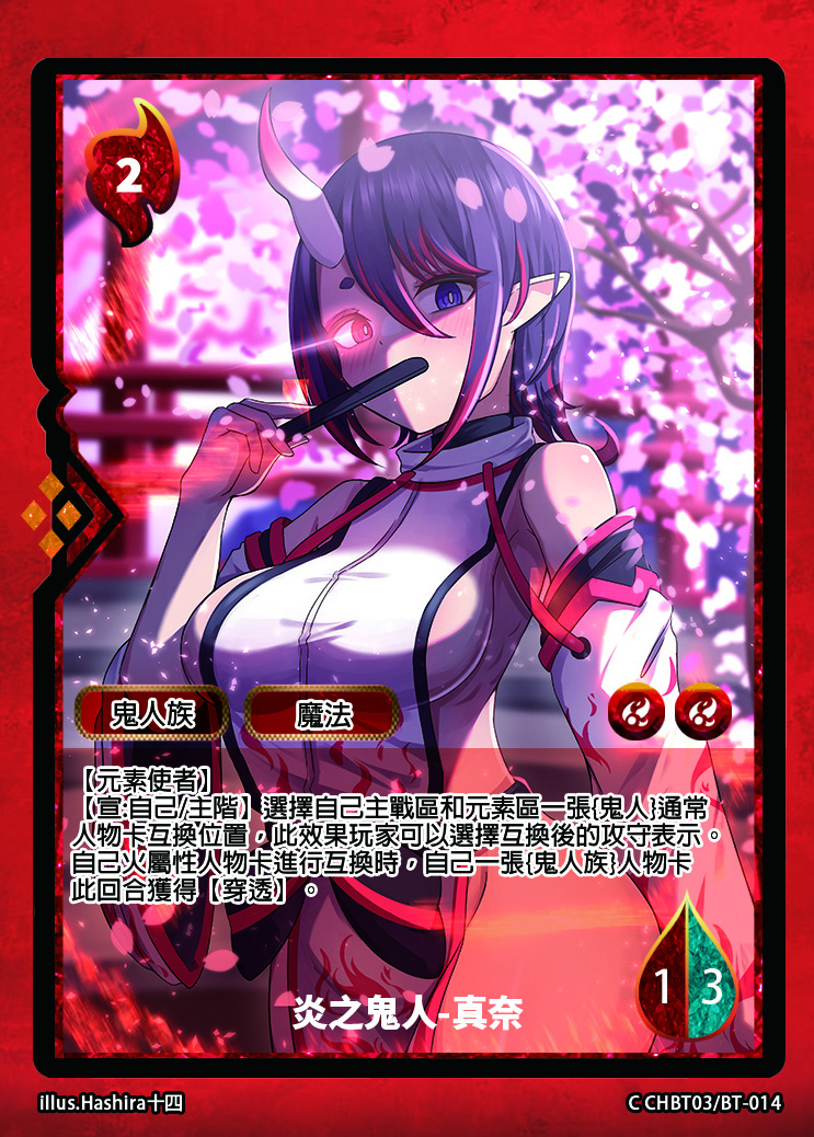 自己火屬性人物卡進行互換時,自己一張{鬼人族}人物卡此回合獲得【穿透】。