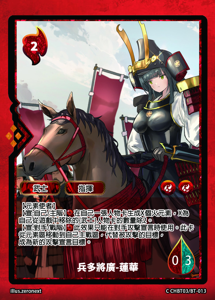 【宣:自己/主階】(火) 在自己一張人物卡生成X個火元素,X為自己從遊戲中移除的{武士}人物卡的數量除2。