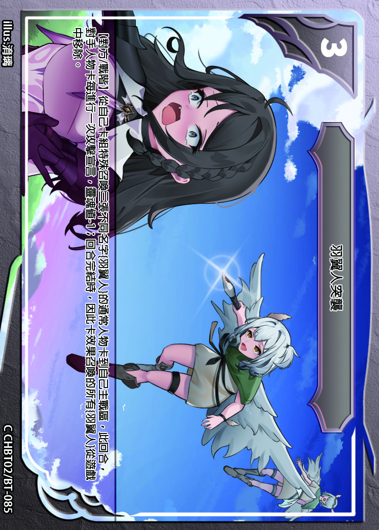 【對方/戰階】從自己卡組特殊召喚三張不同名字{羽翼人}的通常人物卡到自己主戰區,此回合,對手人物卡每進行一次攻擊宣言,靈魂值-1;回合完結時,因此卡效果召喚的所有{羽翼人}從遊戲中移除。