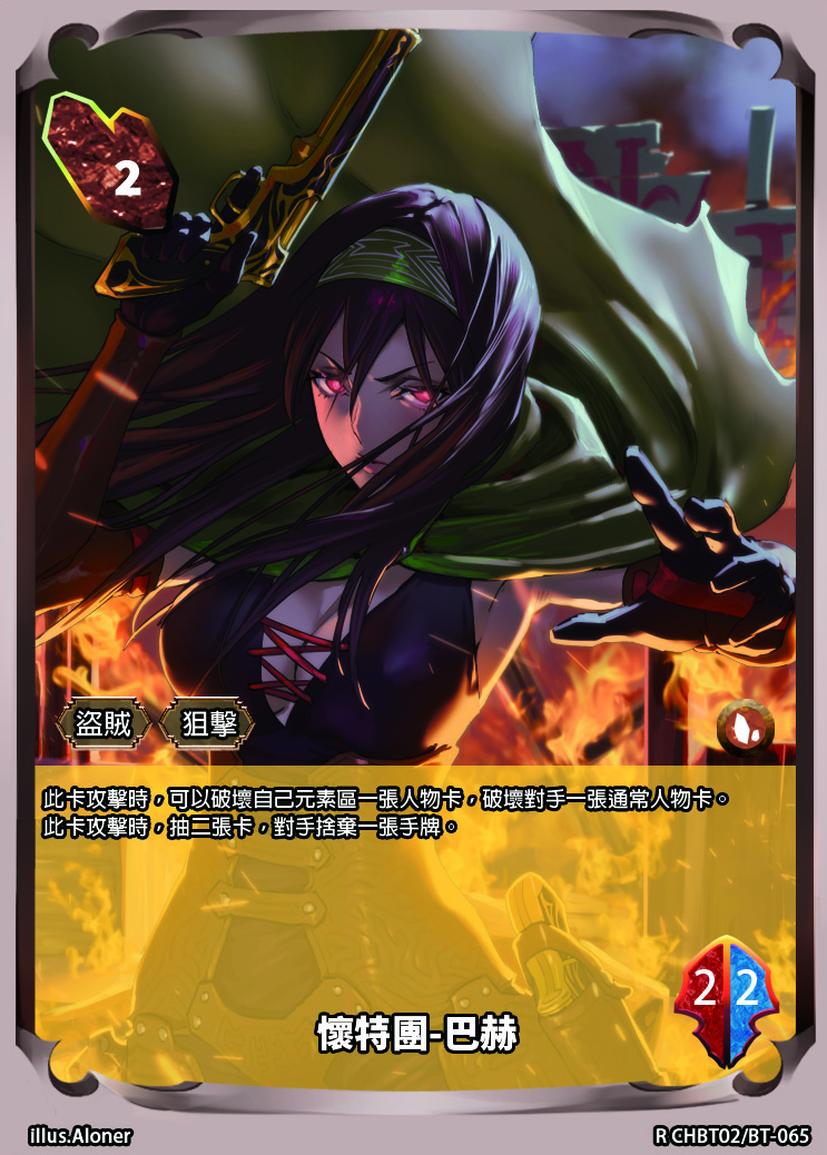 此卡攻擊時,可以破壞自己元素區一張人物卡,破壞對手一張通常人物卡。