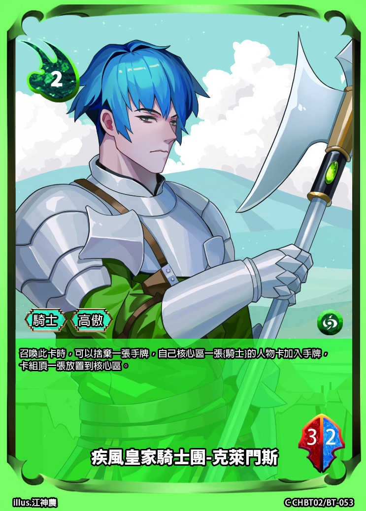 召喚此卡時,可以捨棄一張手牌,自己核心區一張{騎士}的人物卡加入手牌,卡組頂一張放置到核心區。