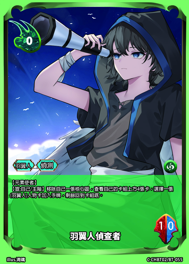 【宣:自己/主階】移除自己一張核心區,查看自己的卡組上方4張卡,選擇一張{羽翼人}人物卡加入手牌,剩餘回到卡組底。