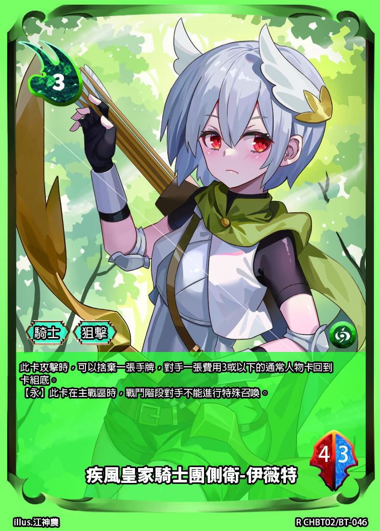 此卡攻擊時,可以捨棄一張手牌,對手一張費用3或以下的通常人物卡回到卡組底。