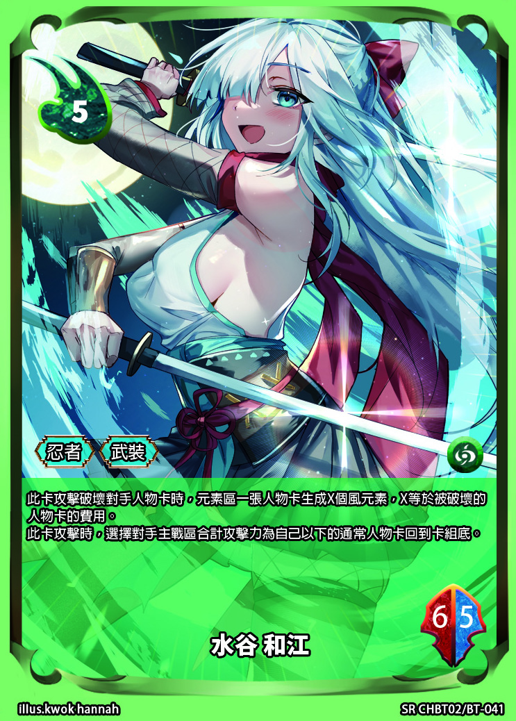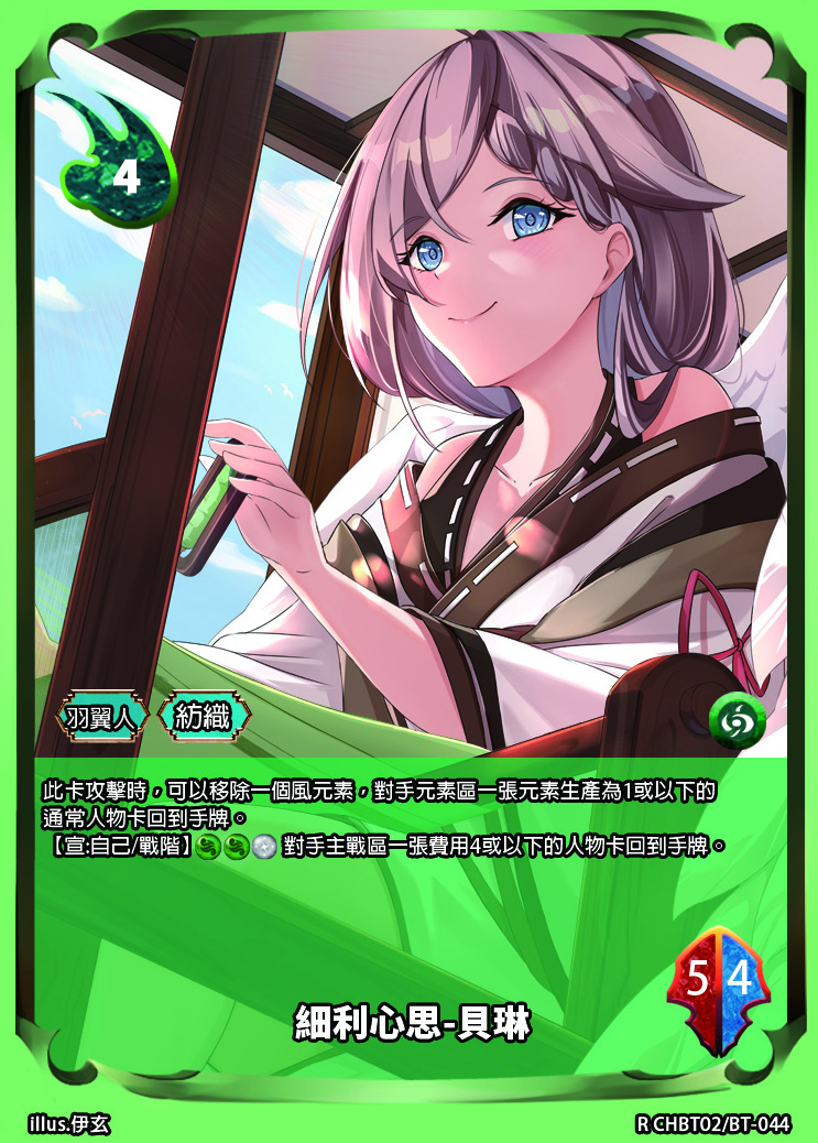 此卡攻擊破壞對手人物卡時,元素區一張人物卡生成X個風元素,X等於被破壞的人物卡的費用。