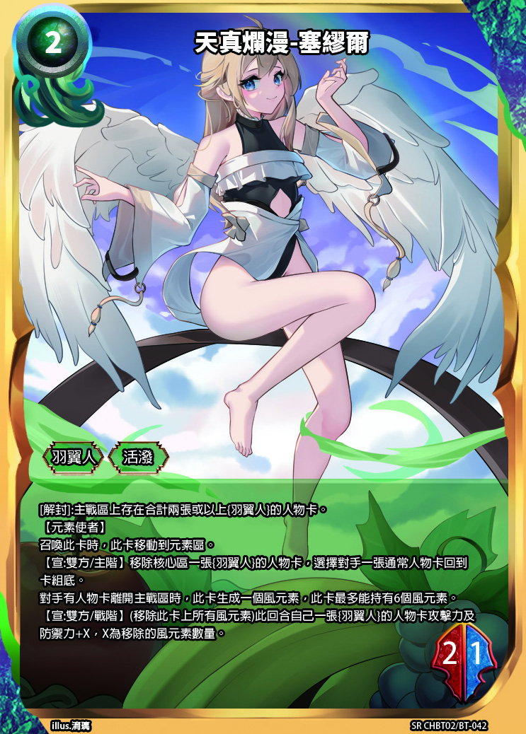 【宣:雙方/戰階】(移除此卡上所有風元素)此回合自己一張{羽翼人}的人物卡攻擊力及防禦力+X,X為移除的風元素數量。