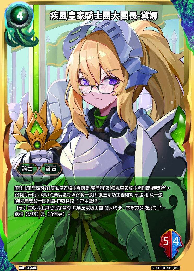 【永】主戰場上其他名字含有[疾風皇家騎士團]的人物卡,攻擊力及防禦力+1,獲得【穿透】及【守護者】。
