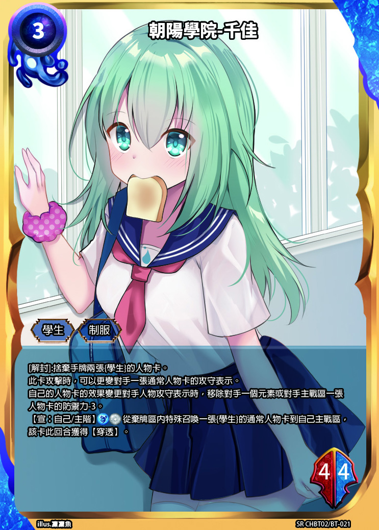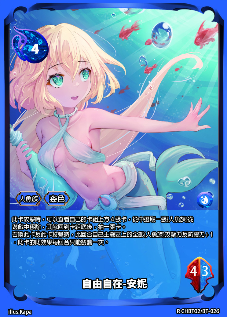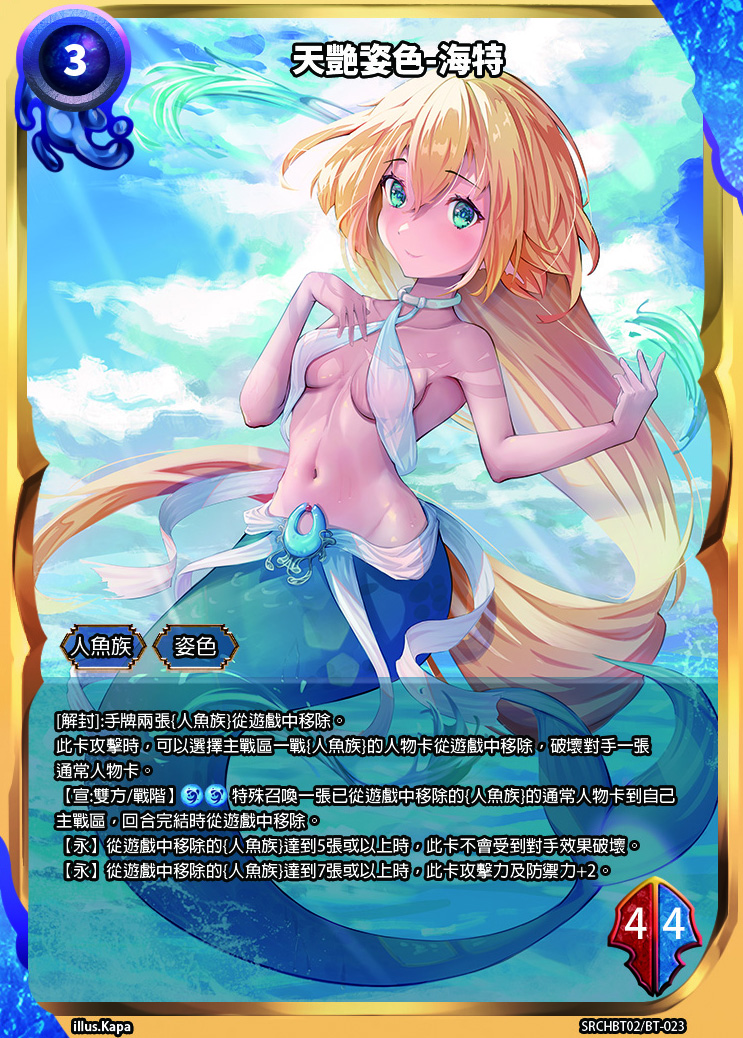 此卡攻擊時,可以選擇主戰區一戰{人魚族}的人物卡從遊戲中移除,破壞對手一張通常人物卡。