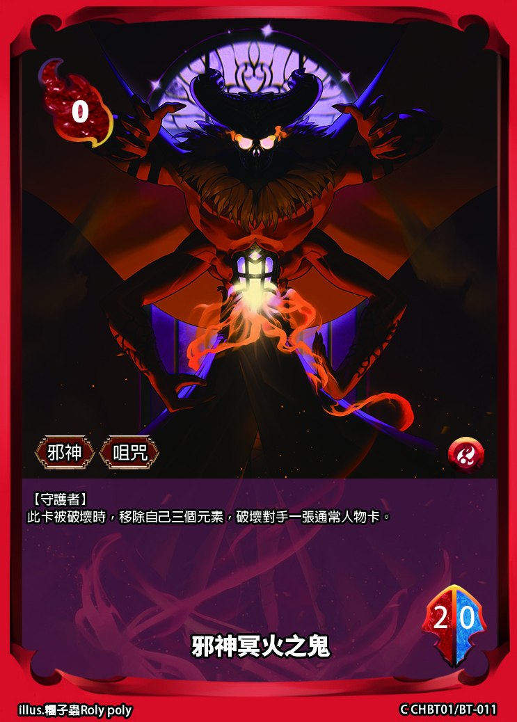 此卡被破壞時,移除自己三個元素,破壞對手一張通常人物卡。
