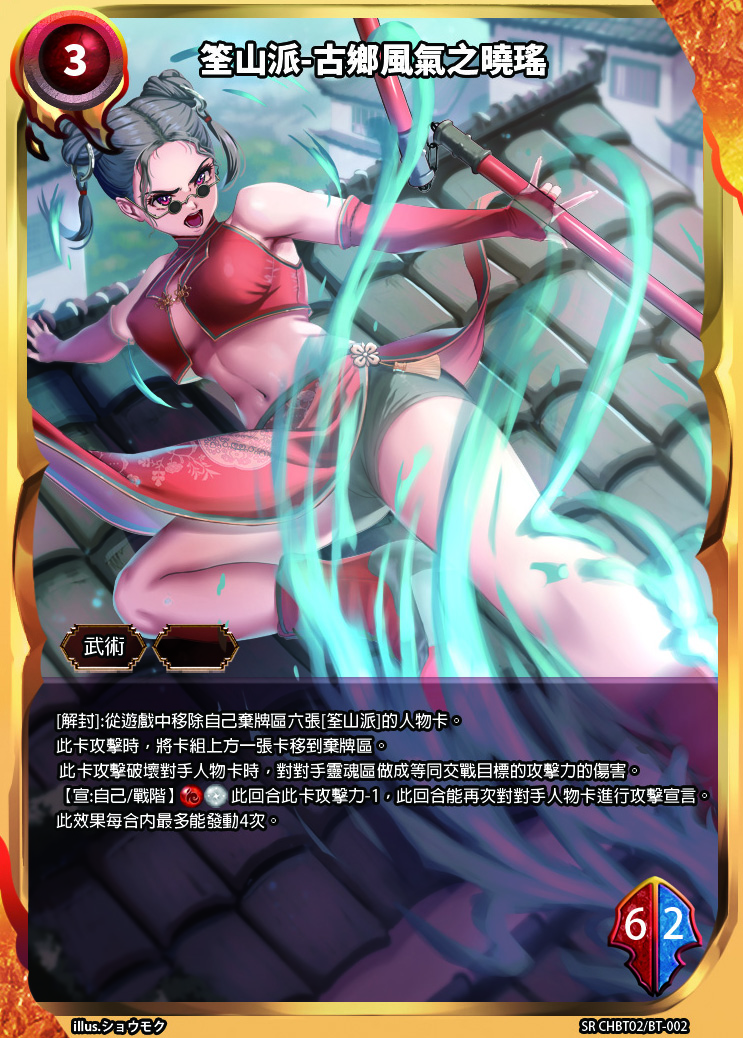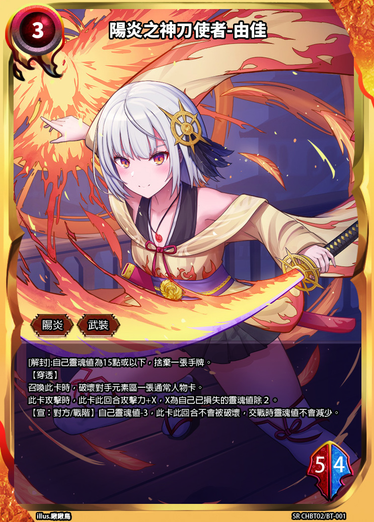 【宣:自己/戰階】(火無) 此回合此卡攻擊力-1,此回合能再次對對手人物卡進行攻擊宣言。此效果每合內最多能發動4次。