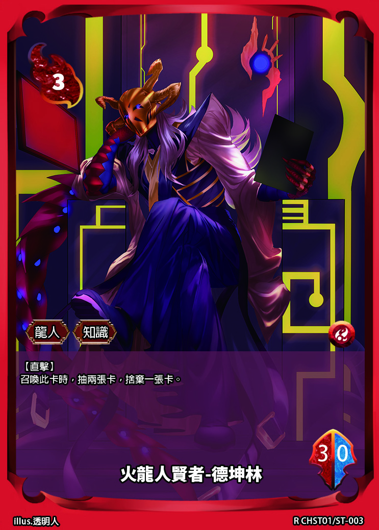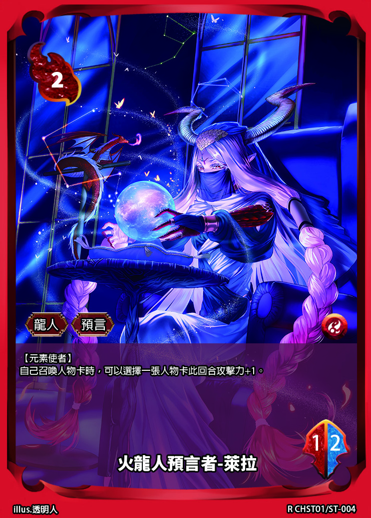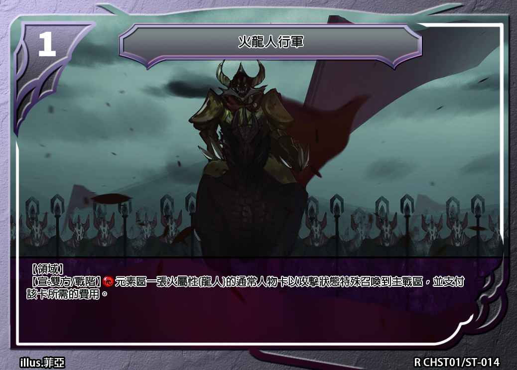 【宣:雙方/戰階】(火) 元素區一張火屬性{龍人}的通常人物卡以攻擊狀態特殊召喚到主戰區,並支付該卡所需的費用。