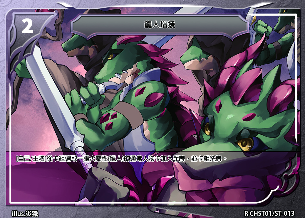 [自己/主階]從卡組選取一張火屬性{龍人}的通常人物卡加入手牌,並卡組洗牌。