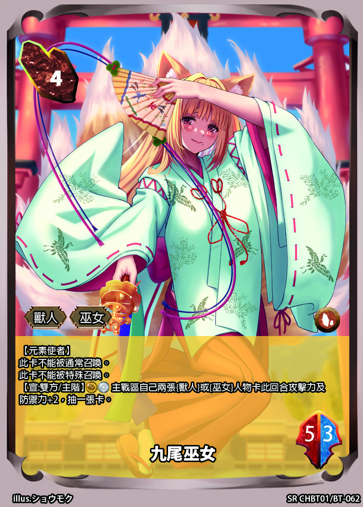 【宣:雙方/主階】(土無) 主戰區自己兩張{獸人}或{巫女}人物卡此回合攻擊力及防禦力+2,抽一張卡。