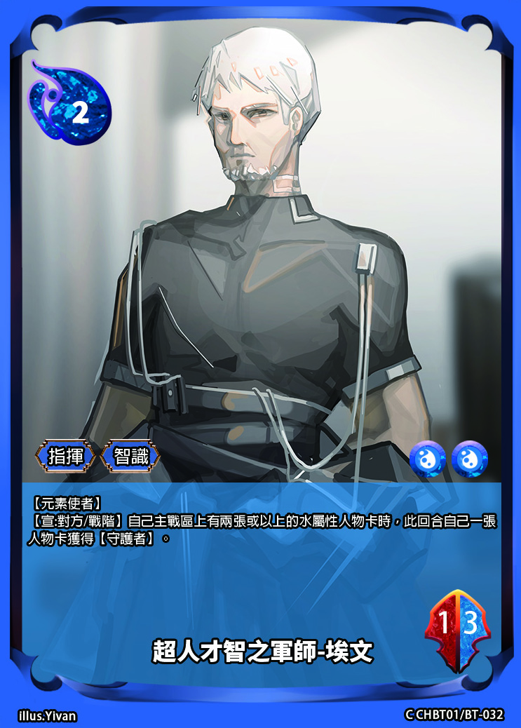 【宣:對方/戰階】自己主戰區上有兩張或以上的水屬性人物卡時,此回合自己一張人物卡獲得【守護者】。