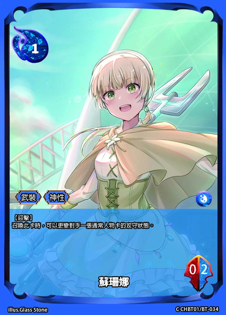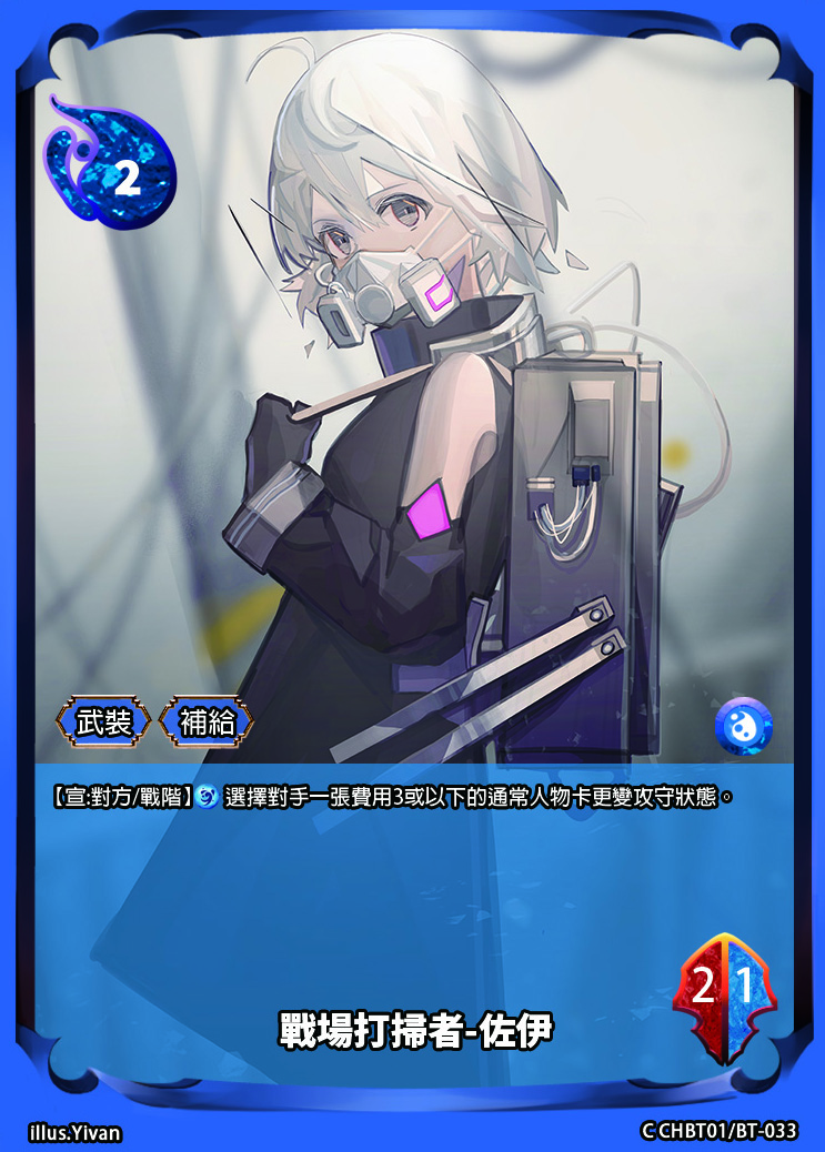 【宣:對方/戰階】(水) 選擇對手一張費用3或以下的通常人物卡變更攻守狀態。