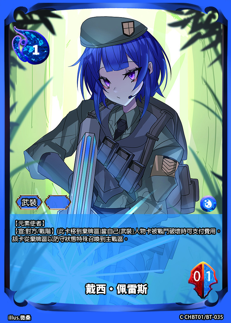 【宣:對方/戰階】(此卡移到棄牌區)當自己{武裝}人物卡被戰鬥破壞時可支付費用。該卡從棄牌區以防守狀態特殊召喚到主戰區。