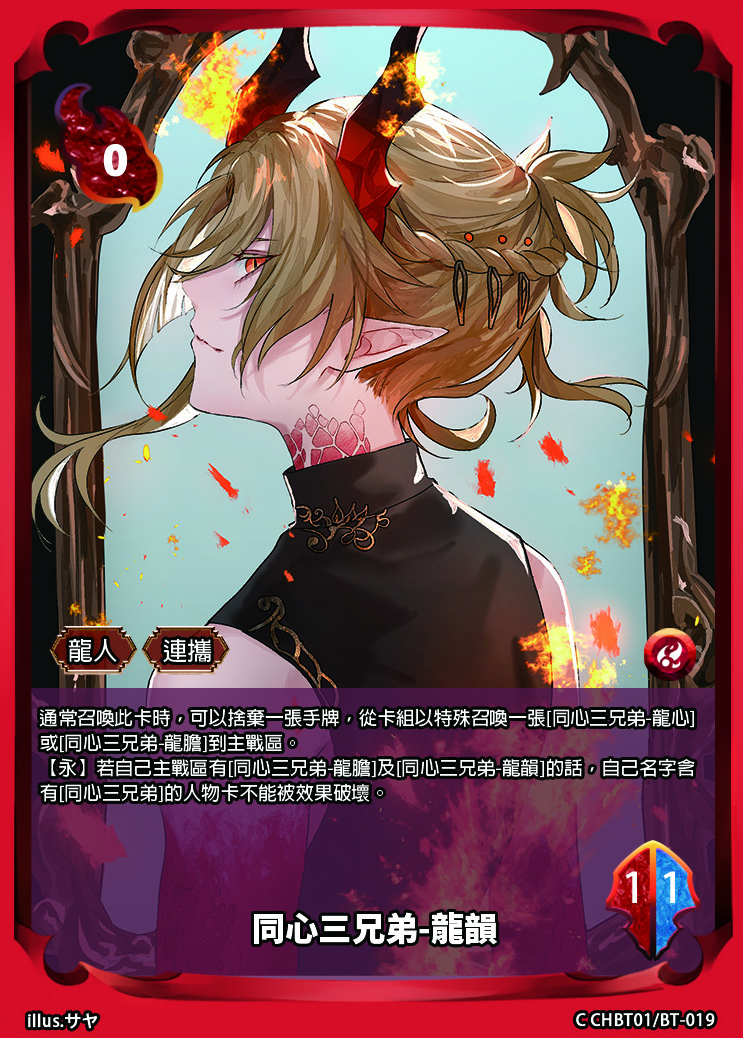 【永】若自己主戰區有[同心三兄弟-龍膽]及[同心三兄弟-龍韻]的話,自己名字含有[同心三兄弟]的人物卡不能被效果破壞。