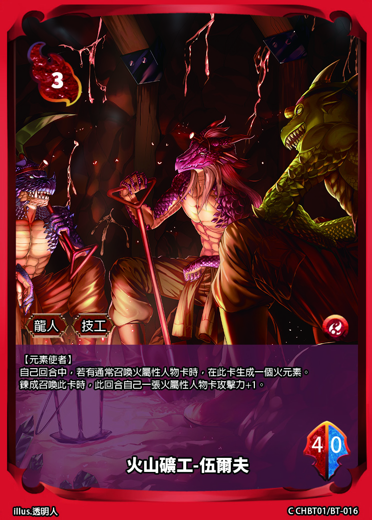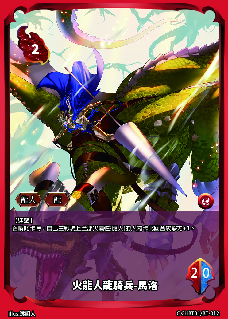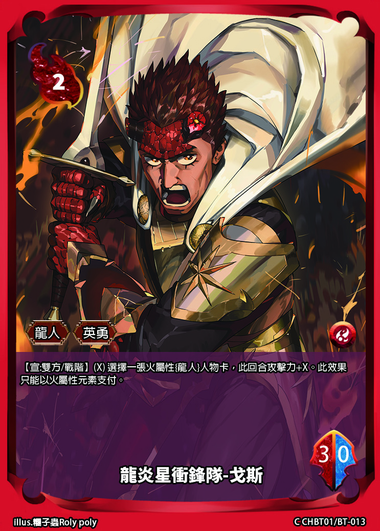 【宣:雙方/戰階】(X) 選擇一張火屬性{龍人}人物卡,此回合攻擊力+X。此效果只能以火屬性元素支付。