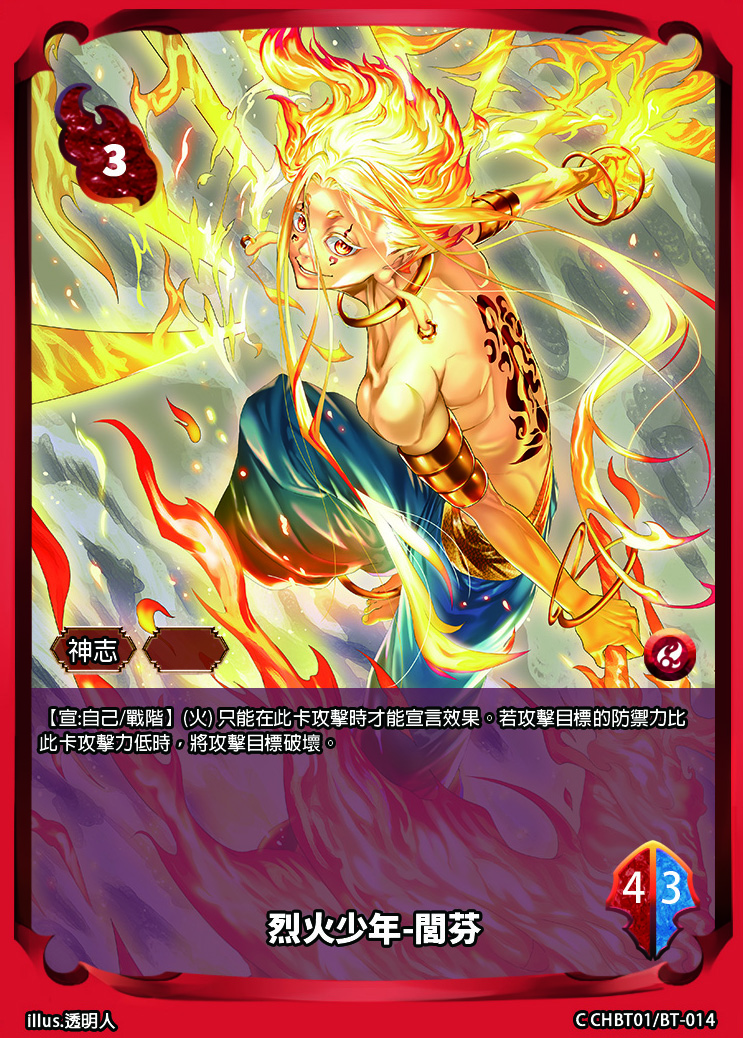 【宣:自己/戰階】(火) 只能在此卡攻擊時才能宣言效果。若攻擊目標的防禦力比此卡攻擊力低時,將攻擊目標破壞。