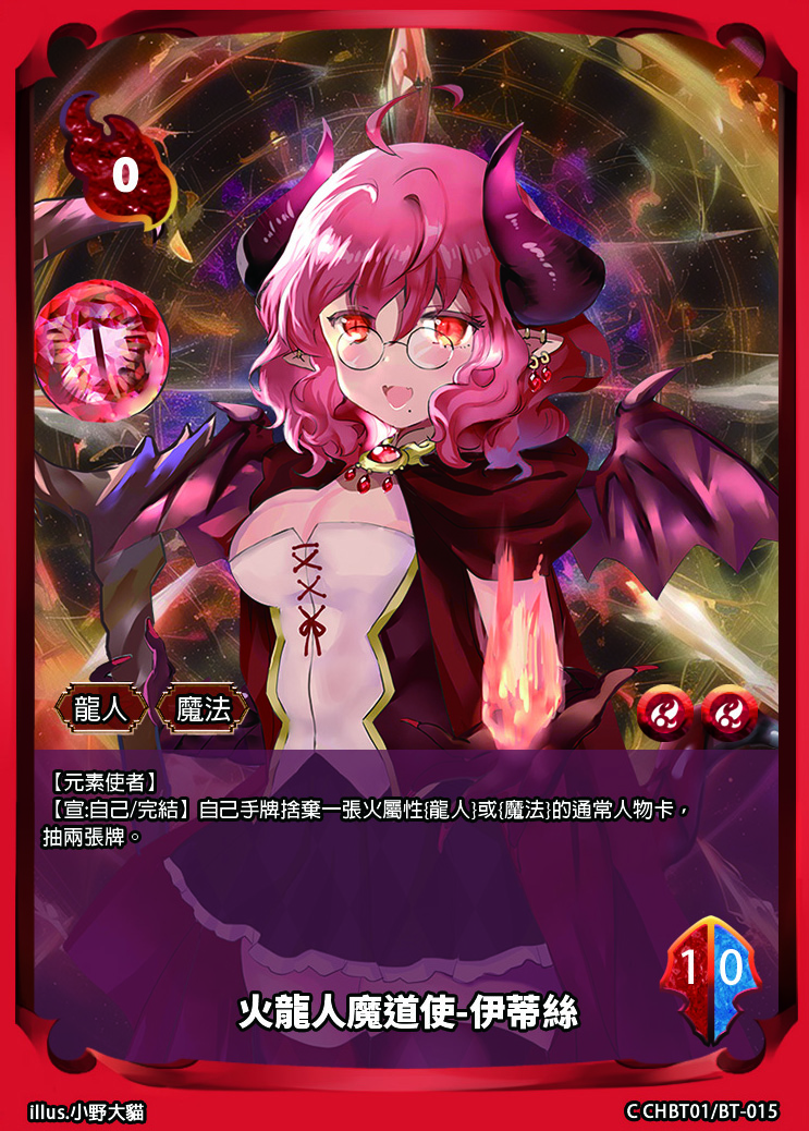 【宣:自己/完結】自己手牌捨棄一張火屬性{龍人}或{魔法}的通常人物卡,抽兩張牌。