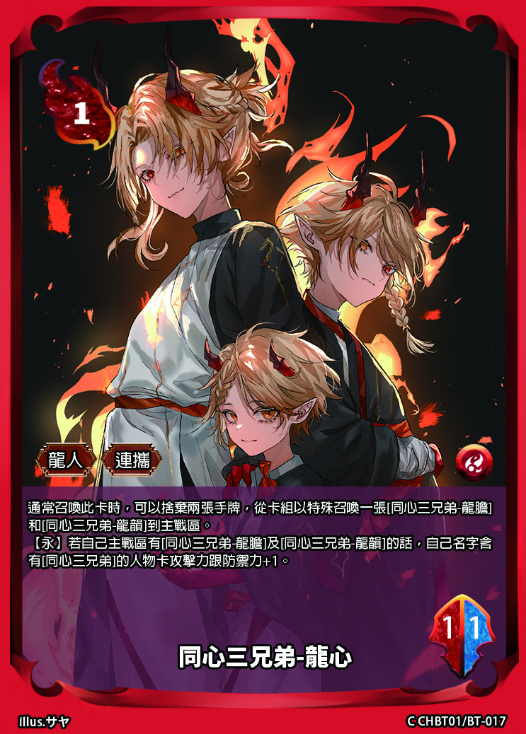【永】若自己主戰區有[同心三兄弟-龍膽]及[同心三兄弟-龍韻]的話,自己名字含有[同心三兄弟]的人物卡攻擊力跟防禦力+1。