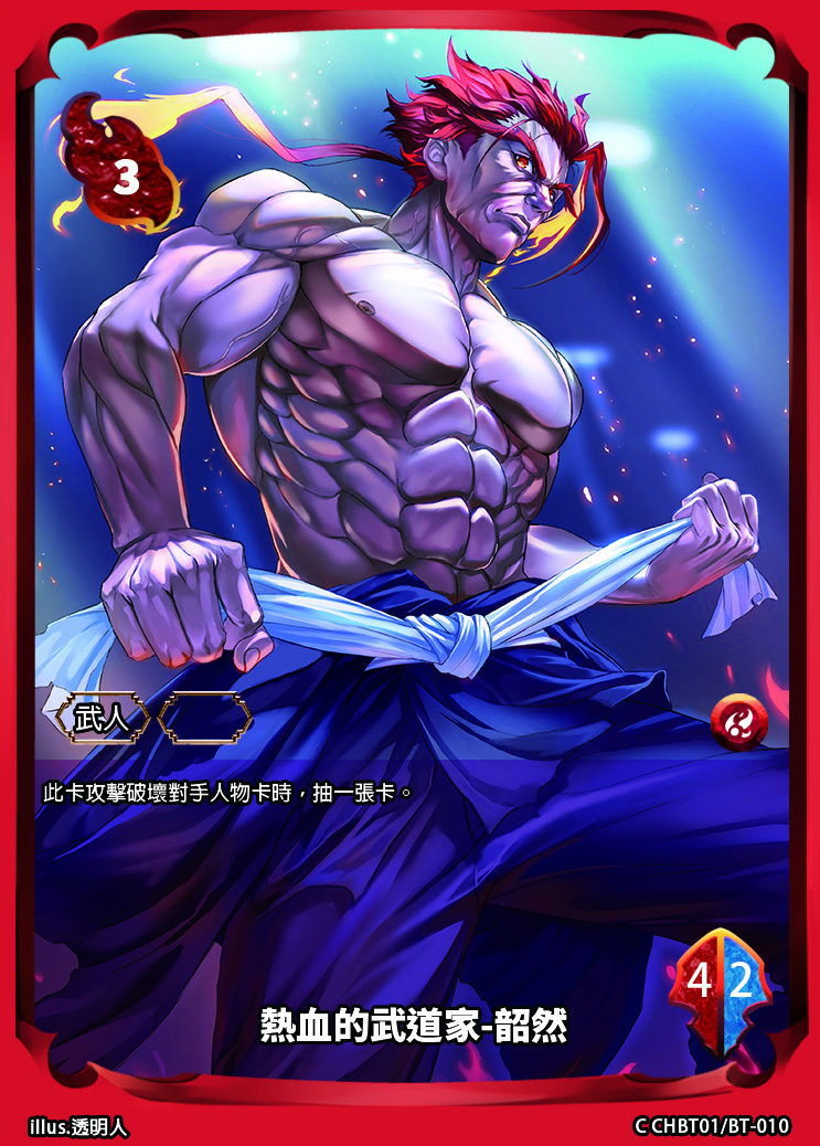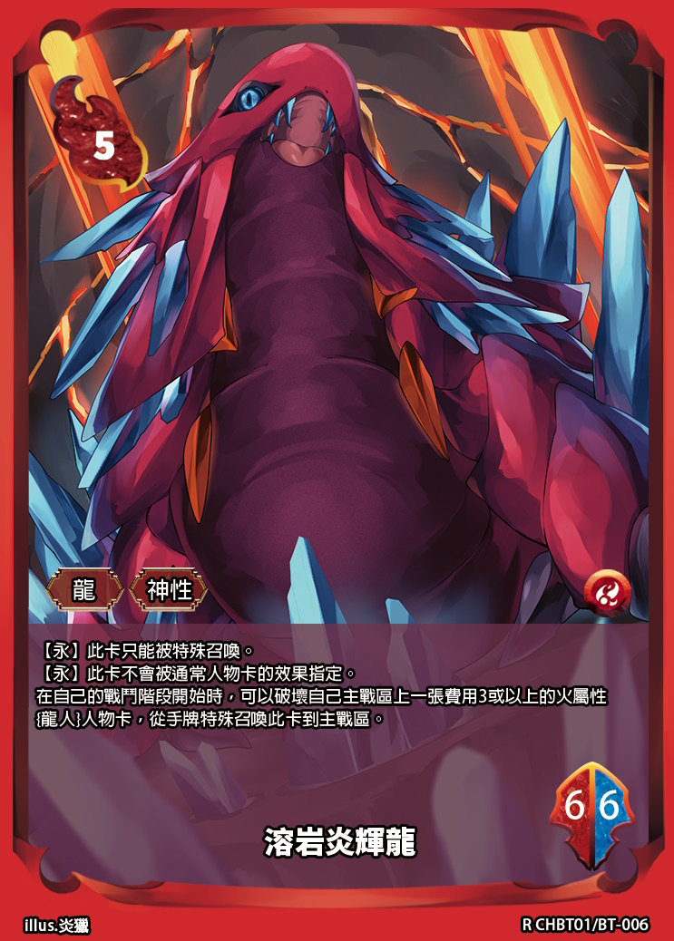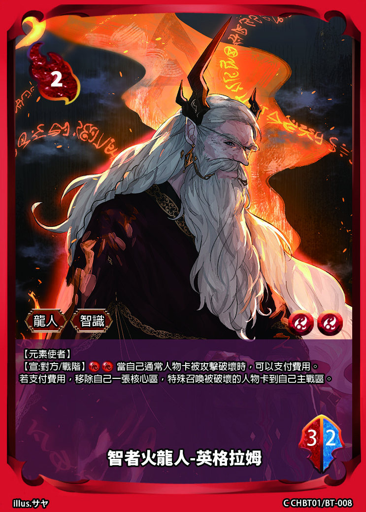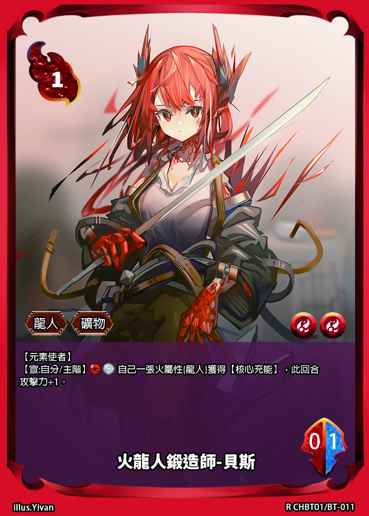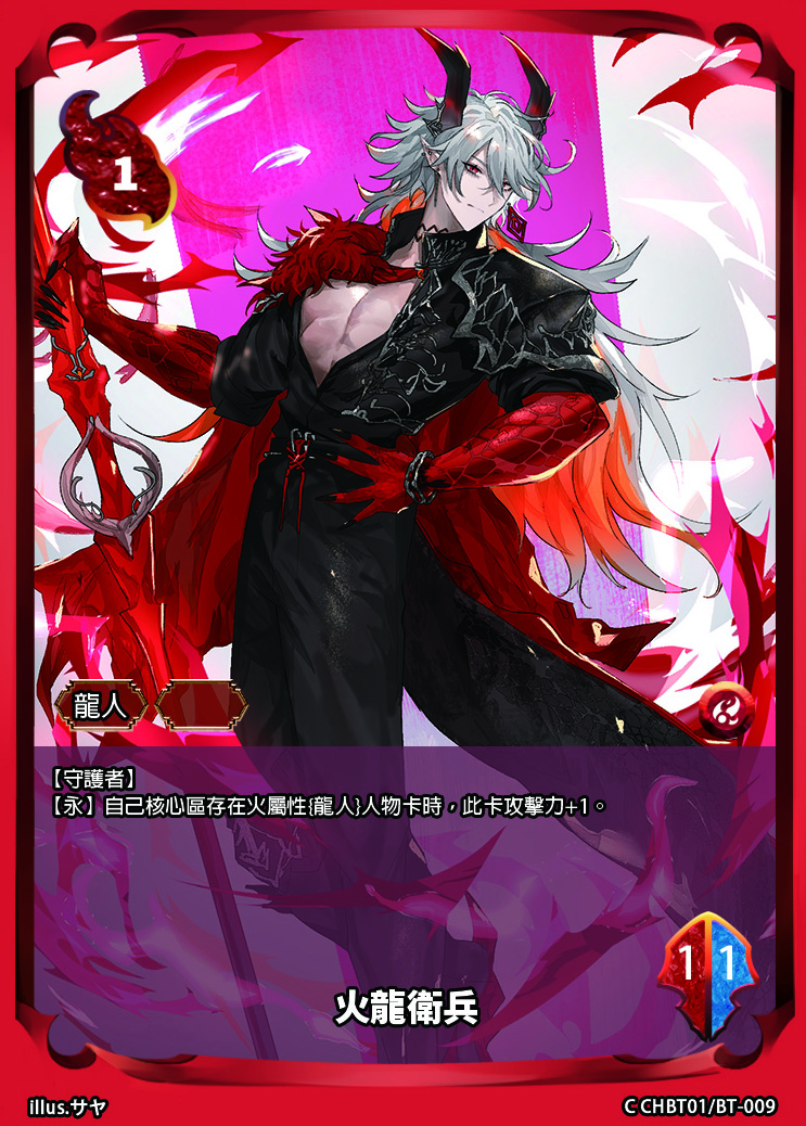 【永】自己核心區存在火屬性{龍人}人物卡時,此卡攻擊力+1。