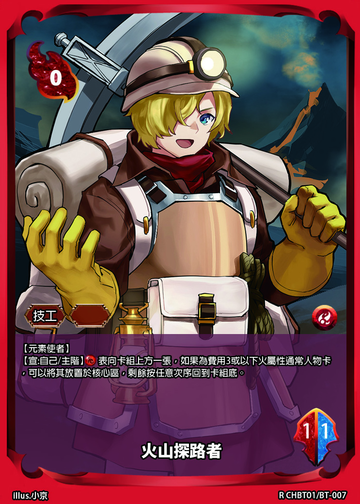 【宣:自己/主階】(火) 表向卡組上方一張,如果為費用3或以下火屬性通常人物卡,可以將其放置於核心區,剩餘按任意次序回到卡組底。