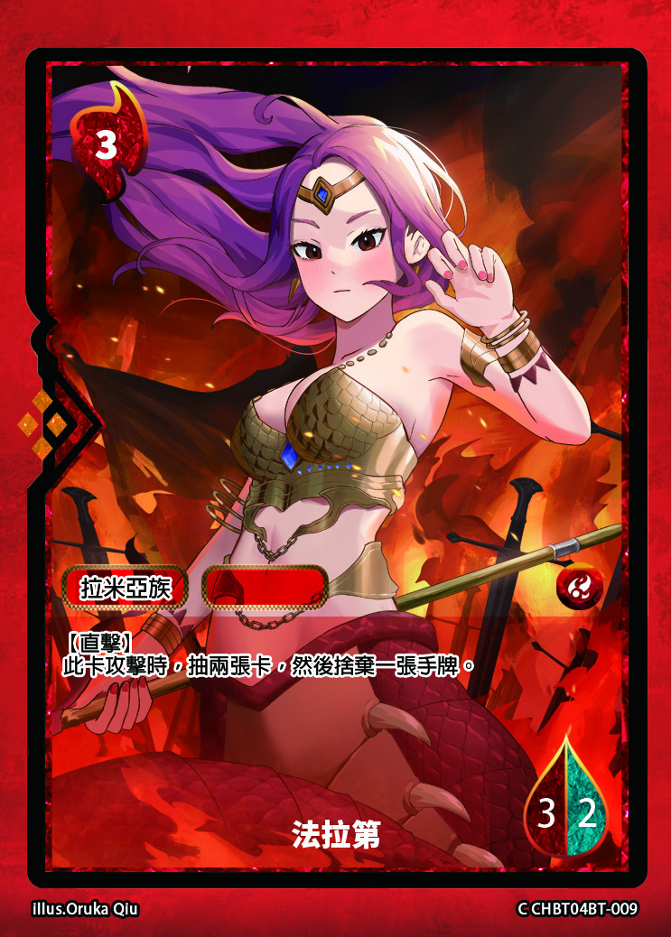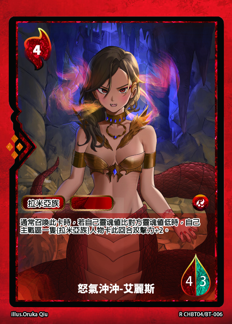 通常召喚此卡時,若自己靈魂值比對方靈魂值低時,自己主戰區一隻{拉米亞族}人物卡此回合攻擊力+2。